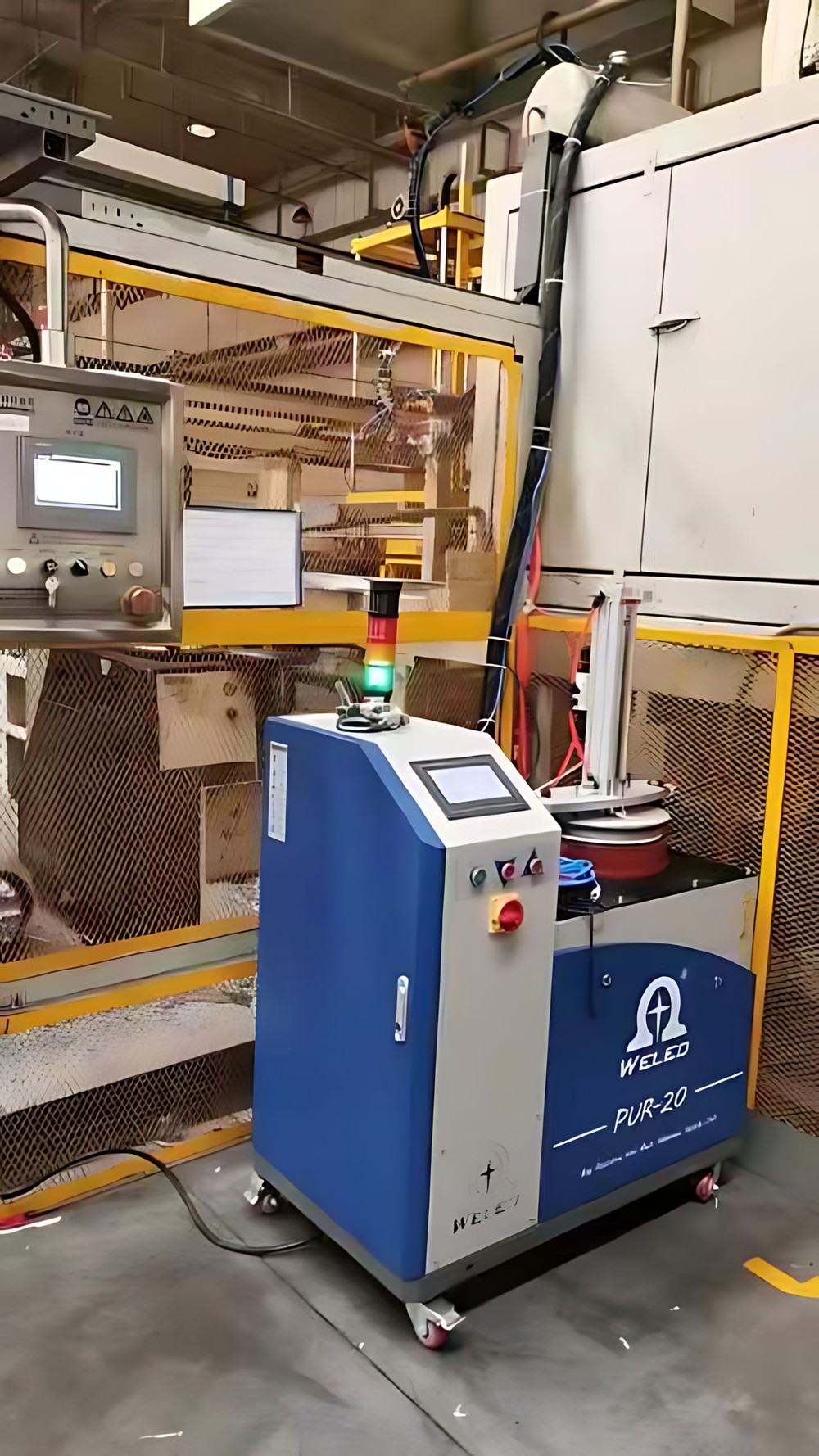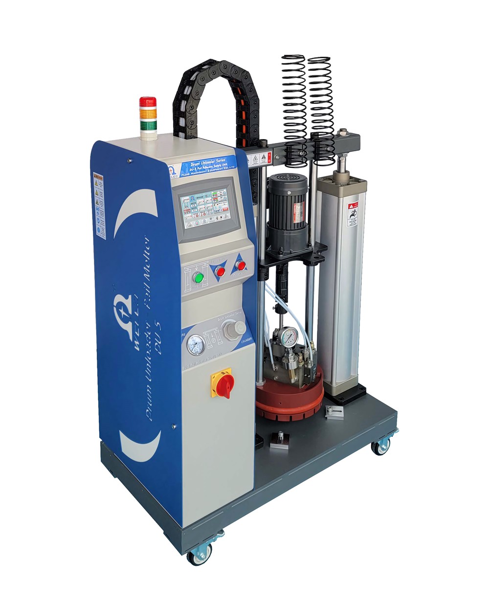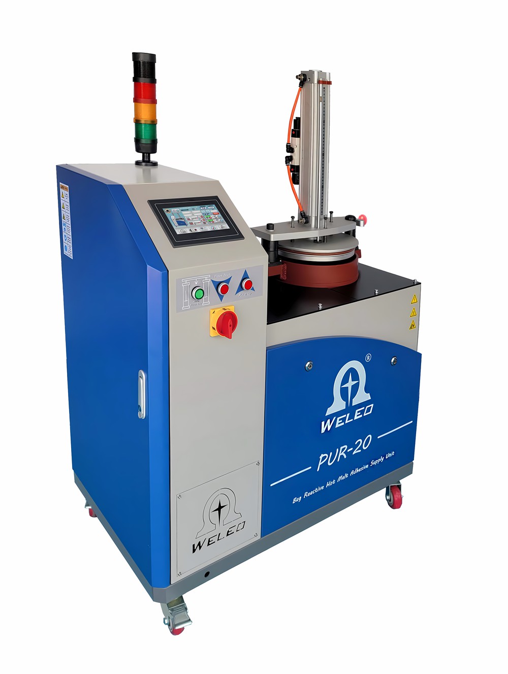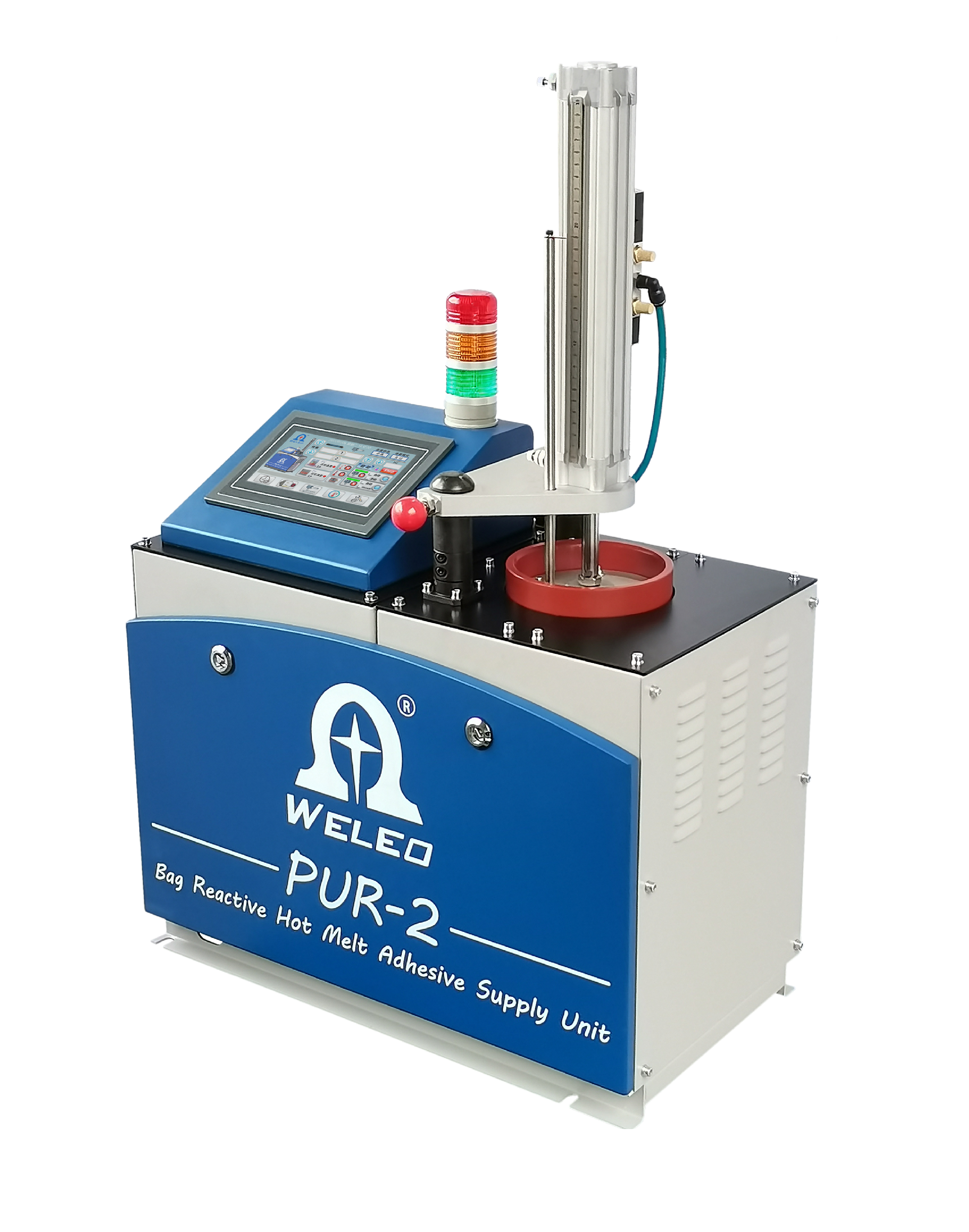 Weleo PUR Hot Melt Adhesive Machines come in two main types. The first type is specifically suited for pouch-type polyurethane reactive PUR adhesives. This machine utilizes a cylinder to press downwards, tearing open the sealed block gasket at the bottom of the aluminum foil packaging bag and directing the adhesive into the lower part of the pressure tank. The middle layer’s hot melt plate is progressively heated to the desired melting temperature, ensuring uniform melting of the adhesive. The melted hot melt adhesive is then stored in the heated melt tank below, maintaining its fluidity.