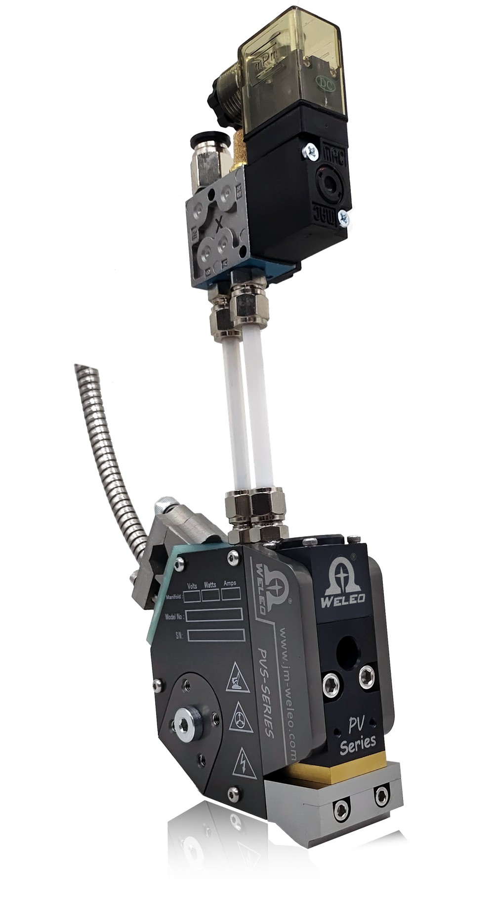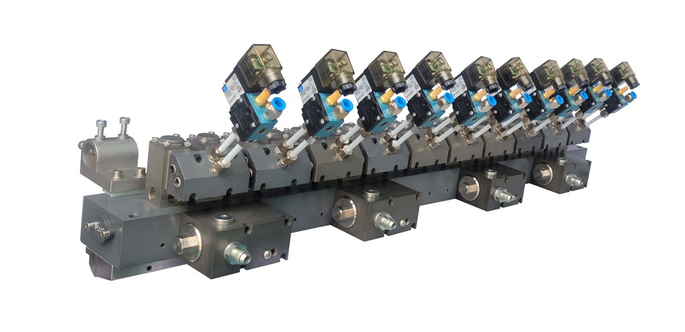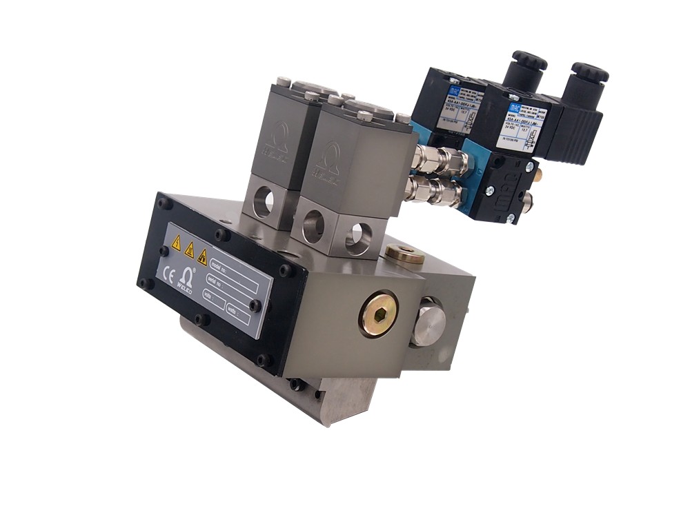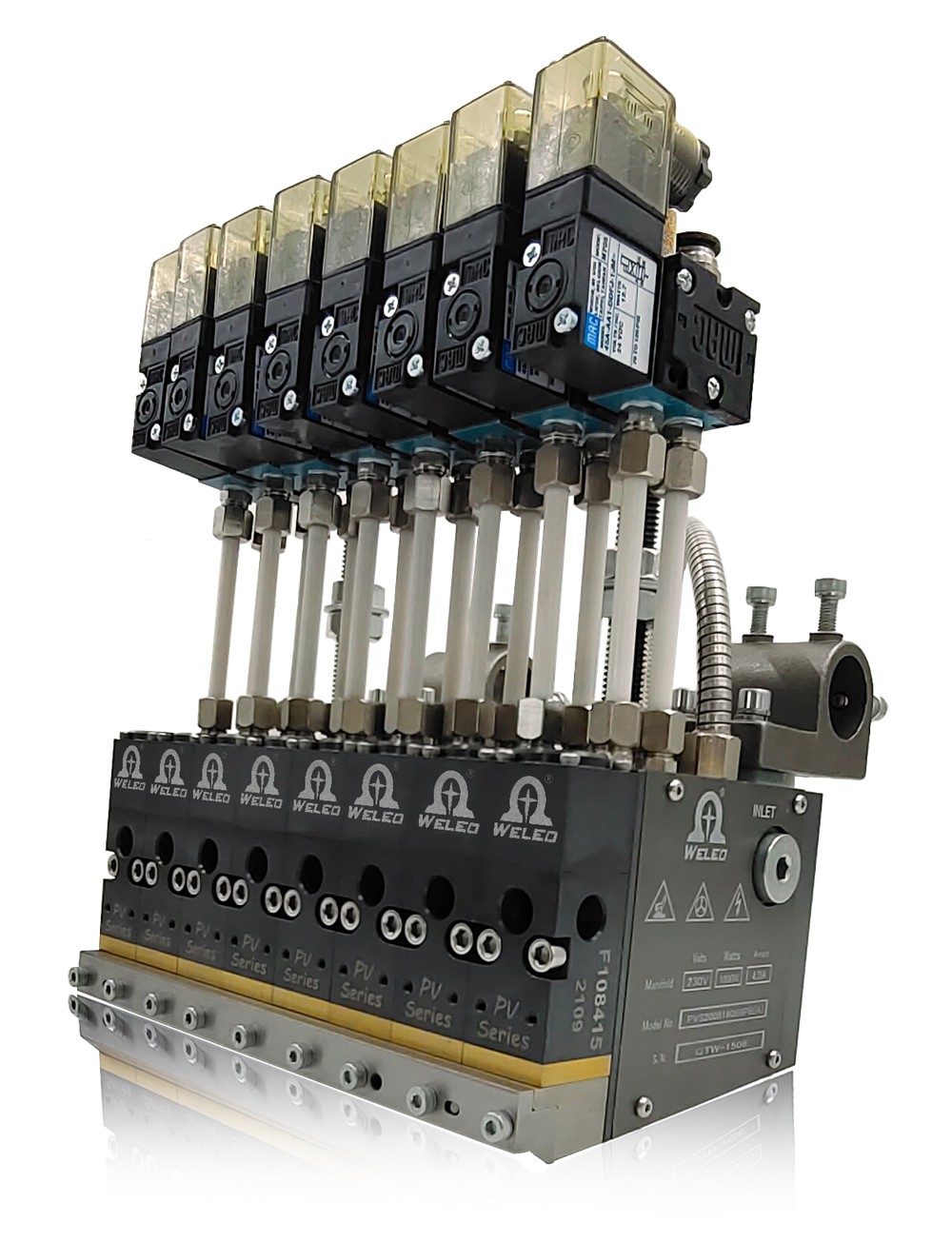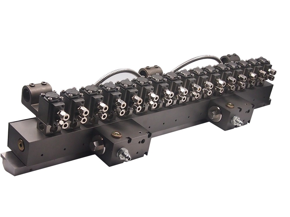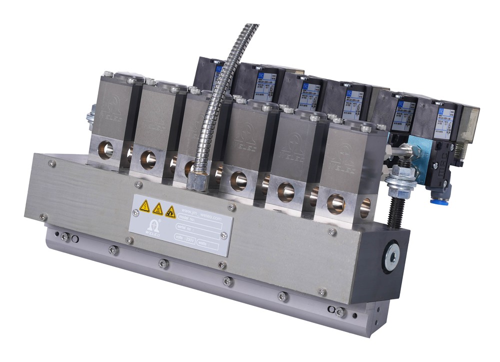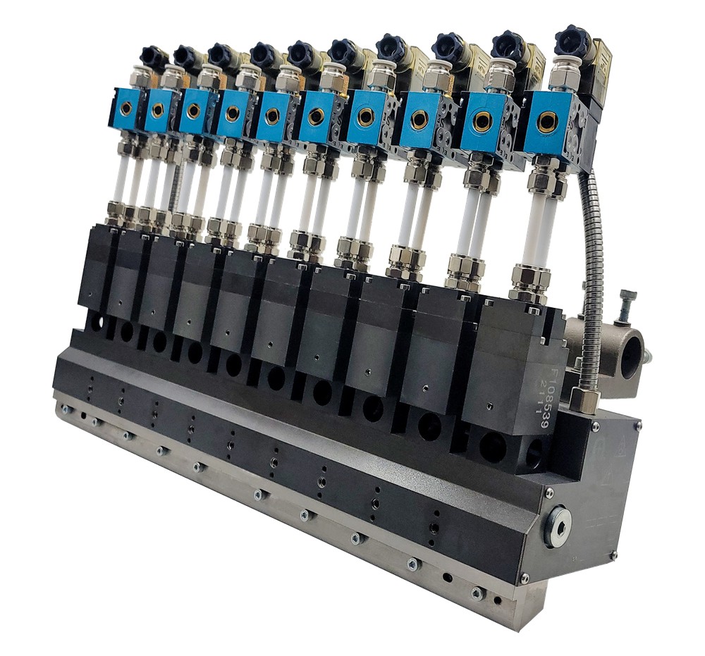 ES serise high-speed intermittent slot die coating head, gun service block has an independent filter block that can be installed in multiple directions connect hose inlet, the coating gun each module is opened and closed by air pressure snuff back module, Springs are used to keep needles closed when no air pressure is supplied to the head, each ES high-speed module is installed above the coating head and the coating lip is installed on the lower of the head to directly control the intermittent coating. The service block heater between module provided an average heating and compatible Pt100 / Ni120 accurate sensors temperaute control.